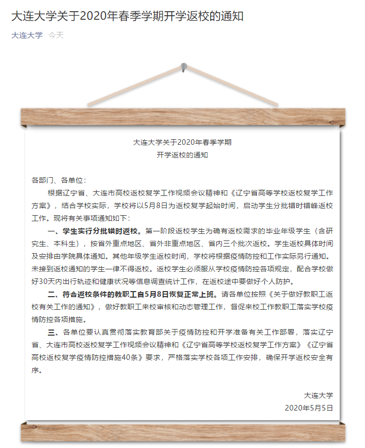 ◆[大连理工大学]自5月8日起,学校分批错时有序组织学生返校。教职工自5月6日起不再实行弹性工作制。