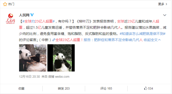 12月26日,世界顶级医学期刊《柳叶刀》发布的一份报告指出,全球范围内,近23亿儿童和成年人超重,超过1.5亿儿童营养不良发育迟缓,并且警告营养不足和肥胖会影响几代人。也就是说,世界上的肥胖人群已经占到了总人口的30.3%。而我国的超重人群也达到了3.41亿,高居全球榜首。