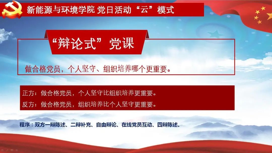 云模式 党日的主要内容是进行“辩论式”党课: 做合格党员,个人坚守、组织培养哪个更重要。由疫情防控党小组成员组成的正反方开门见山,引经据典,论据有力,辩论中,正反双方条理清晰、观点鲜明。自由辩论环节,在线党员共同参与,讨论个人坚守和组织培养对做合格党员的必要性。“辩论式”党课后,在线党员以“始终站在时代前列,发挥先锋模范作用,做合格党员”进行在线讨论,党员表示会努力做坚定践行习近平新时代中国特色社会主义思想的合格共产党员,以青年党员之理想铸中国梦。