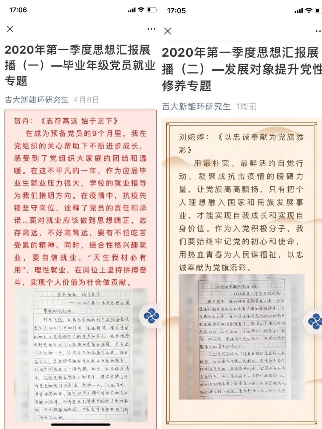 党课 第一季度思想汇报展播: 关注毕业年级研究生预备党员和2020年发展对象思想状态,在微信平台开展第一季度思想汇报展播活动,毕业年级预备党员以就业为主题撰写思想汇报,分享就业心得,引导在校学生明确就业方向、转变就业意识、顺利实现就业。发展对象以疫情下的责任担当、提升党性修养为主题撰写思想汇报。