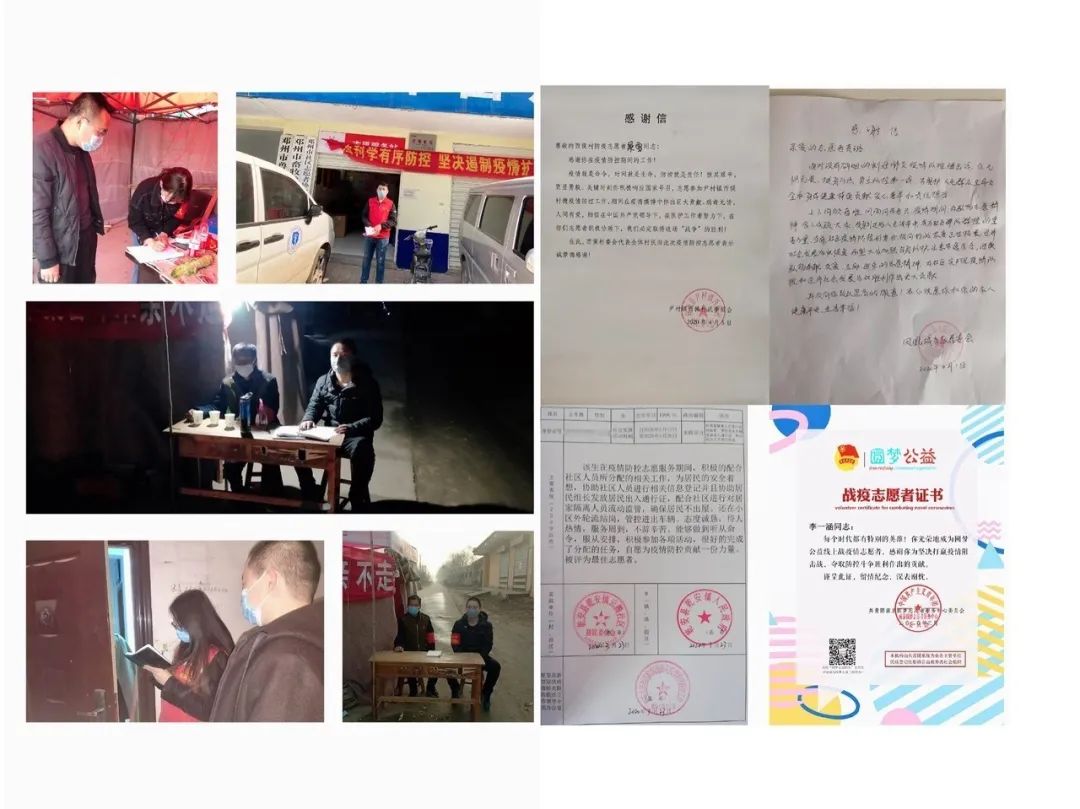 五、“我守我乡”,防控疫情学子显担当 2019级地下水科学与工程专业贾璐:有幸加入了我所在的河北省邯郸市曲周县凤凰城社区防疫小组,负责体温测量、登记、排查外来人员。我相信:没有一个冬天不可逾越,没有一个春天不会来临。让我们众志成城,共渡难关,坚决打赢疫情防控阻击战。 2018级环境工程专业梁雪:作为党员,我成为了尹村镇西候村疫情防控工作的一员,排查村民居住和旅行史,统计村民健康情况,使我深深的感受到在党和国家指挥下大家的凝聚力和行动力,使我感受到了中国共产党领导下中国的蓬勃生命力。 2019级地下水科学与工程专业李一涵:我成为了圆梦公益的一名战疫网宣志愿者,为大家分享每日疫情发展情况,转发募资项目,通过网络让大家即时了解疫情数据,录制视频为武汉加油时,让我感受到了自己在这场疫情中的价值,体会到团结的力量。 2017级环境工程专业鲁松:我在邓州市紧临湖北襄阳市南桥店社区参与了疫情防控工作,与工作人员轮流执勤,弘扬正能量,为实现疫情防控胜利贡献自己的力量。 2019级地下水科学与工程专业硕士研究生王冬爽:我在乾安镇云腾社区参与了防控的工作,协助社区人员进行排查和统计,东北室外气温还很低,站在室外很快就会被寒风吹透。这次工作体会到疫情防控期间工作者们的辛苦,感谢所有在疫情期间坚守岗位的工作者们。 2017级地下水科学与工程专业郭兵:我在张鲁回族镇于楼村与工作人员承担村口值岗工作,作为即将走上工作岗位的我,应该主动担当,加入到守护家乡,打赢战疫的队伍中。