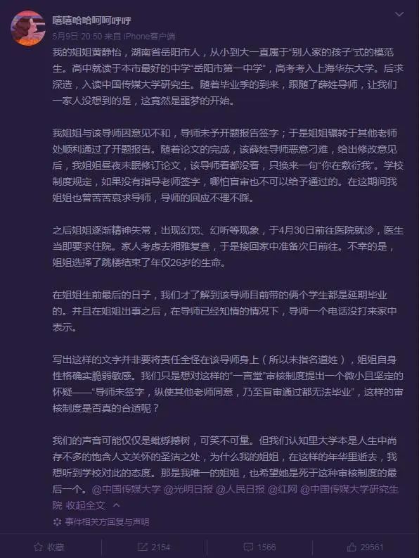 目前正是该校毕业季,毕业年级的学子们都在紧张地修改自己论文,以便准备即将到来的毕业答辩。然而也正是毕业论文问题,将年仅26岁的黄静怡逼上了绝路。根据论文答辩的流程,毕业生需要首先提交答辩材料给答辩委员会,以便答辩委员会根据答辩者的论文提出相应的问题。不过在答辩材料提交之前,必须要经过导师审核并签署同意意见。也就是说,即便你论文质量再好,只要导师不签署同意意见,那么你的论文就交不上去,就更别说后续的毕业答辩了。