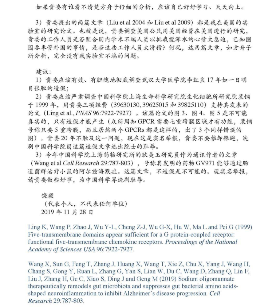“今年中国科学院上海药物研究所耿美玉研究员作为通讯作者发表的文章,宣称其发明的药物GV971能够通过肠道菌群治疗小鼠的阿尔茨海默症。这篇文章,不造假是不可能的。”2019年11月,饶毅的一封举报信草稿在网上传播,引发学术界一次“大地震”。