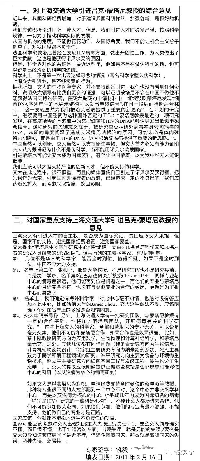 针对吕克・蒙塔尼耶曾任上海交通大学讲席教授这一头衔,饶毅附上了对2010年高校提议引进的这一专家的意见。“科学界对他的共识是:最近这些年,他如果不是在做伪科学的话,也可以说是已经滑到伪科学的边缘。”饶毅认为,上海交大引进吕克・蒙塔尼耶,是不够负责的行为。