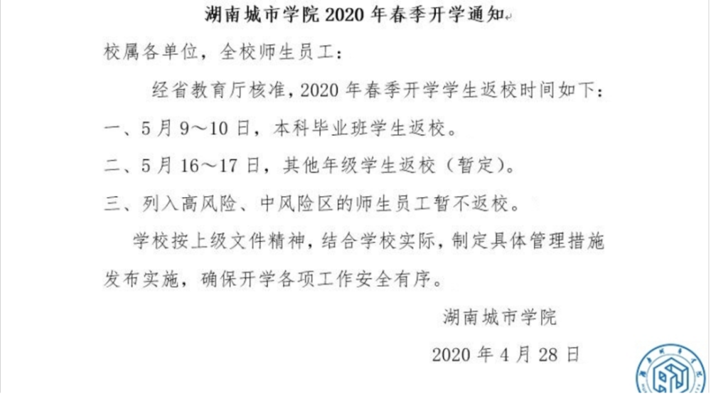 4月28日,湖南城市学院经湖南省教育厅核准后,发布了2020年春季开学通知。这是湖南省最早公布开学时间的高校。通知表明:5月9日-10日,本科毕业生返校,5月16-17日,其他年级返校。