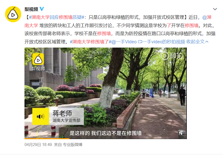 日前,湖南大学堆放的砖块和工人的工作照引发讨论,不少同学猜测这是学校为了开学在修围墙。对此,湖南大学宣传部回应,学校并不是修围墙,而是为防控疫情在路口以岗亭和绿植的形式,加强开放式校区区域管理。