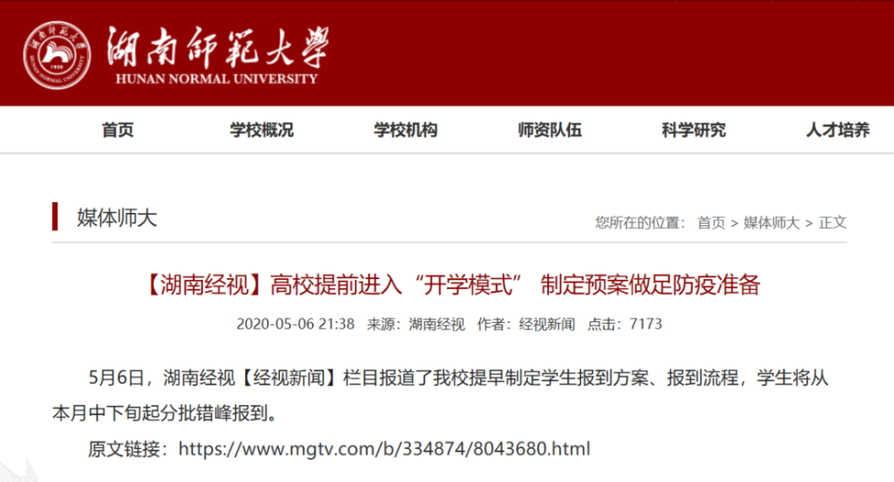 另外,记者注意到湖南师范大学在5月6日发布文章,文章内容显示学校学生将于本月中下旬分批错峰报到。
