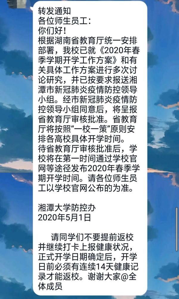 湘潭大学目前同样没有发布正式开学通知,不过,该校学生向记者提供了学校老师在年级群里发布的相关信息。内容大致为湘潭大学已经提交《2020年春季学期开学工作方案》。本学期初步教学方案为6月底、7月初完成所有教学工作。
