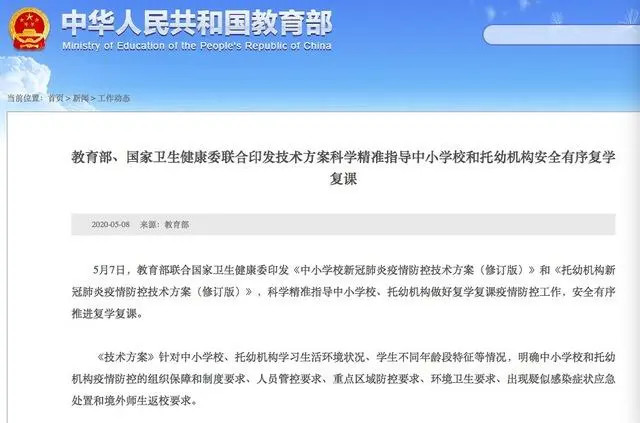 5月7日,教育部和卫建委联合印发中小学和托幼机构安全有序复学复课的指导方案: