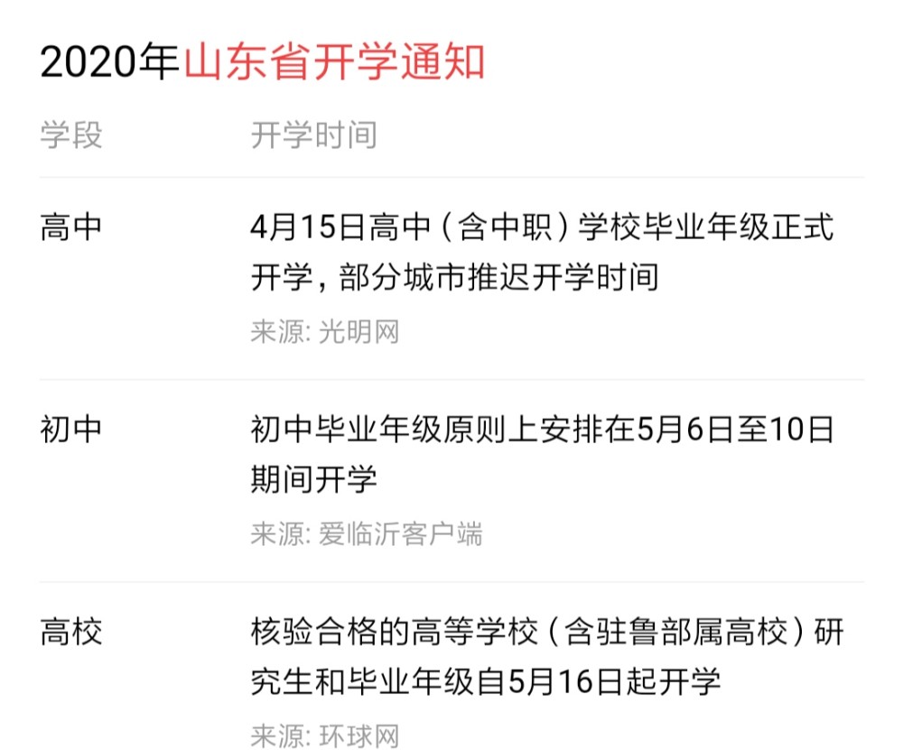 山东目前只确定了初中、高中、高校毕业年级返校时间,而其他年级具体开学日期还未正式公布,