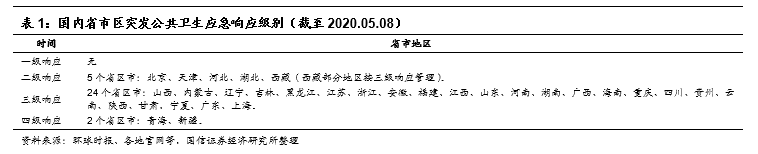 疫情防控向好态势进一步巩固。根据国家卫建委5月8日发布会消息,目前我国疫情总体呈零星散发状态,个别地方出现聚集性疫情,疫情防控向好的态势进一步巩固,同时要有针对性地加强外防输入、内防反弹的举措;也明确提出,分类有序开放公共场所。与此同时,各地陆续下调疫情防控等级。截至5月8日,全国已无一级响应级别省份,二级响应级别省份5个,三级响应级别省份24个,四级响应级别省份2个。疫情的范围、性质和危害程度有所降低。