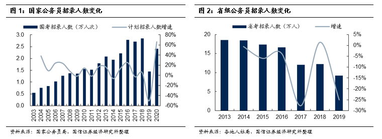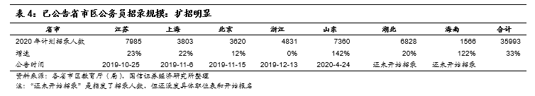 省考:一方面是前述江苏省、上海市明确了面试工作时间;另一方面,各省区市也开始陆续公布省考招录公告或招录计划。结合我们的持续跟踪,山东率先开始了省考报名;此外湖北、海南等明确公布了招录人数(但还未开始招录)。而且可以看出,疫情发生后公布的招录人数有更加明显的扩招倾向。目前已经统计到的公布了招录人数的省市区共7个,合计扩招33%;再结合2020年国考扩招66%,我们预计2020年省考整体有望扩招30%-50%。