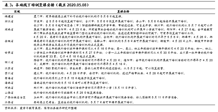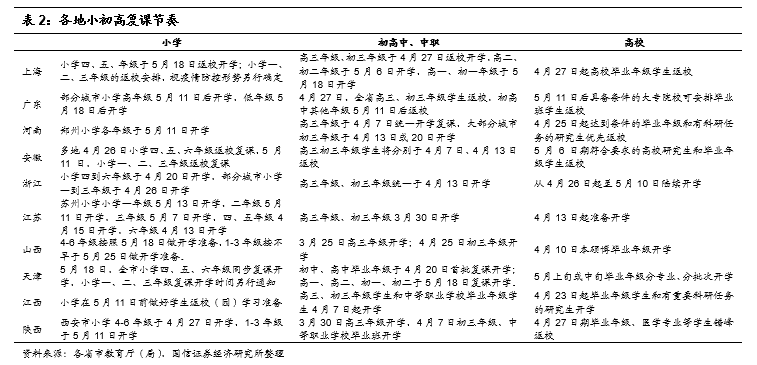 随着疫情防控持续向好,各地小初高等复课有序推进。如下表所示,大多数省份的初三、高三及部分中职的毕业班,多在4月中下旬开学,高校也在4月中下旬-5月中上旬陆续复课,最为谨慎的小学低年级及部分幼儿园也陆续在5月中下旬安排复课。学生复课开学已逐步进入正轨,线下培训机构也相应迎来解禁。