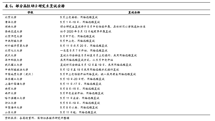 考研复试:考研培训方面,初试成绩及国家线分别于2.20/4.14(去年为2.15/3.15)公布,但因疫情影响,寒假考研复试培训班暂停,而往年多数高校在3月底完成招录。目前各高校已陆续通知考研复试时间,但已公告高校很多选择了网络远程面试,多在5月中下旬到6月上旬举行,也还有部分高校暂未通知。复试方式的改变,以及复试时间相对较紧,预计可能会对培训机构的培训产生一定影响。但考研培训占公司业务的比重相对较低(2019年收入占比约为8%),以及公司也积极采取线上方式教学,加上硕士研究生扩招18.9万人,预计考研面试培训对公司的影响也相对可控。