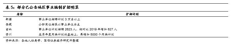 事业单位:受疫情影响,部分省市2020年事业单位扩招信号明显,新疆、西藏、吉林、贵州等地相继发布通知,明确要求扩大事业单位招录规模,增加用编计划。在国家稳就业政策指导下,叠加机构改革后红利释放,预计2020年各省市事业单位有望扩招。