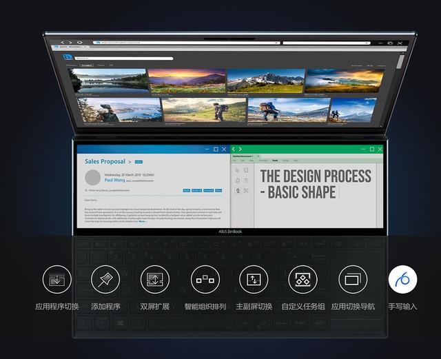 可以同时进行多任务处理是华硕灵耀X2 Duo的一大优势。其C面键盘上方搭载的ScreenPad Plus全高清触控屏能与主屏幕进行协同合作,进一步延伸用户的可观看视野范围,内置一系列便捷工具,让用户可同时运行至多五个应用程序,实现程序间互不干扰却又交互合作的个性化高效办公模式。当用户在使用Adobe全家桶等创作工具时,主屏幕定义为编辑区域,副屏可放视频轨、素材箱等工具栏,旁边还能查询网页或本机素材库,让灵感双屏协作中跳跃,颠覆传统使用体验。