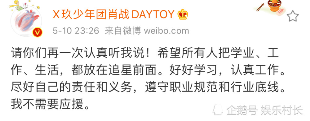 当晚,肖战在微博平台,原文写道:“请你们再一次认真听我说!希望所有人把学业、工作、生活,都放在追星前面。好好学习,认真工作。尽好自己的责任和义务,遵守职业规范和行业底线。我不需要应援。 ”从文字来看是肖战喊话粉丝把学业、工作等放在追星之前,但从语气来看能看出肖战的无奈。
