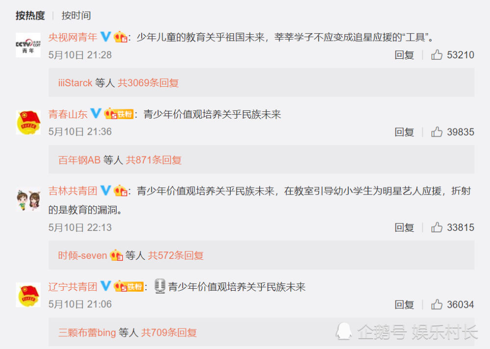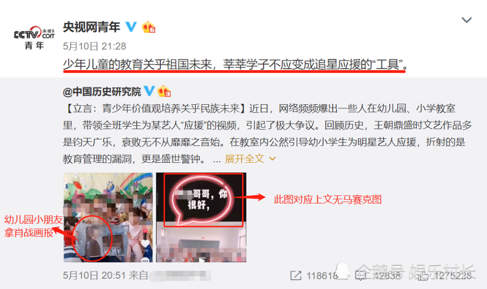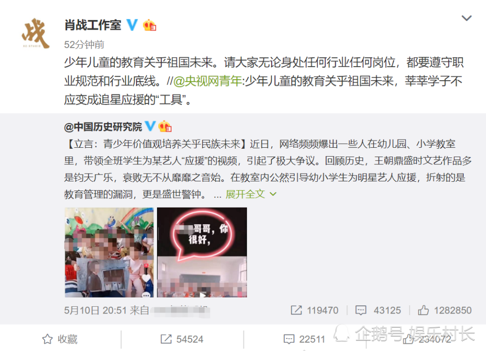 首先发声的是中国历史研究院,文中指出事情后评价这是教育管理的漏洞更是盛世警钟,此事件引发了极大的争议。后续,央视、共青团以及其它很多官媒转发评论,直言“青少年价值观培养关乎民族未来”。虽然未曾提及肖战的名字,但是配图却全部是幼儿及小学生应援肖战的图片。