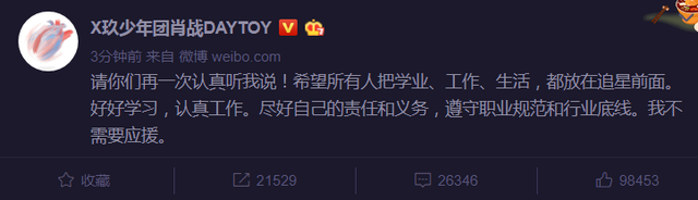 5月10日晚,肖战本人在社交平台发文回应了关于粉丝应援一事,只见他态度诚恳地喊话粉丝:“请你们再一次认真听我说!希望所有人把学业、工作、生活,都放在追星前面。好好学习,认真工作。尽好自己的责任和义务,遵守职业规范和行业底线。我不需要应援。 ”回应了近期的粉丝应援事件。