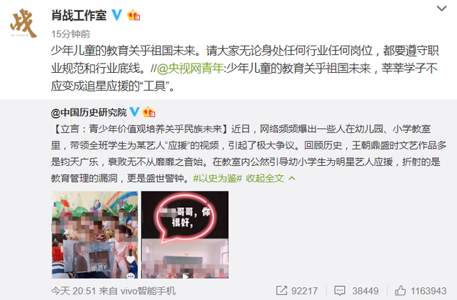 这种类似“洗脑”小学生的行为更是令许多网友大为反感,许多官媒纷纷点名批评这一乱象,甚至央视都站出来发声:“少年儿童的教育关乎祖国未来,莘莘学子不该变成追星应援的工具”。