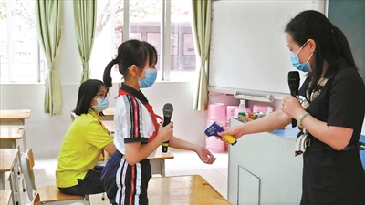 连续几天,东莞多所小学陆续开展疫情应急处置演练。5月7日,南城阳光第四小学开展了第二次疫情防控应急处置演练。演练模拟复学后最可能发现疫情的场景,共设置了上学篇(入校门),教室学生篇(课堂突发情况)、教师篇(办公室突发情况)、晴天放学接送篇、雨天放学接送篇五个篇章。
