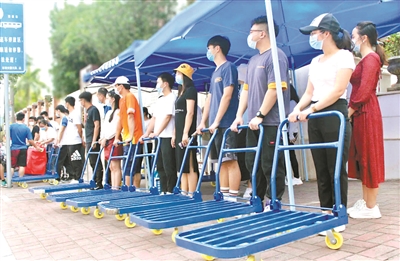 家长不能进校园,寄宿学生的行李那么重,怎么送到宿舍?在学生正式返校前,东莞市光明小学打造特别的行李“传输带”。家长送行李到校不需下车,只要打开后备厢,教职员工将行李搬下来,车子就可以驶离了。然后,教职员工用小推车将行李送到相应的学生宿舍。几天来,该校教职工已将6000多份沉甸甸的行李送到宿舍。