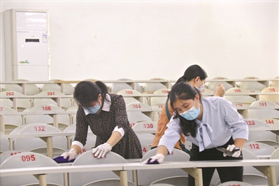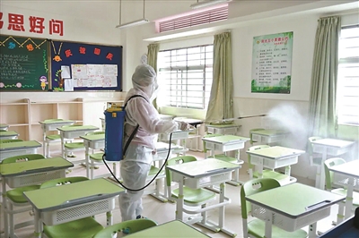 南城阳光第四小学在学生返校前开展相关演练。 学生返校前,南城阳光第五小学的教室已做好消毒工作。 光明小学的教职工用小推车将学生的行李搬运到宿舍。 广东医科大学在学生返校前做好教室的清洁工作。