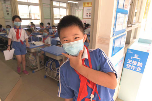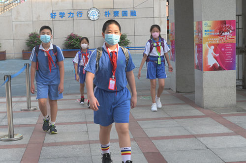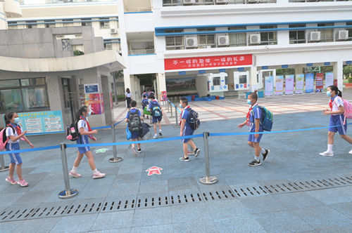 黎新风表示,返校复课后,各校区还将通过红外线测温通道和心理咨询室守护学生身体和心理健康。学校还列出了学生返校必备清单:每位学生上学前进行体温监测等健康日报、上学书包必备一个防疫用品包、认真学习防疫卫生指南。 除了学校、老师们的“护航”,家长们还成立了义工队,帮助维持秩序,为孩子们服务。返校复课后,学校不同年级实行错时错峰上下学,保证了学生们健康;同时,还实行了每日学生有序入校:学生们在校门两侧一米线上排队,通过热成像测温通道入校。 伴随着校园音乐铃声,四至六年级学生们返校的一天正式开始。《返校第一课》是学校为孩子量身打造的开学宝典。课室内举行完庄严的升旗仪式后,黎新风向四至六年级返校的师生们问好,欢迎师生们平安健康的回到校园。班主任老师们通过妙趣横生的课堂内容调整孩子们心理健康,帮助孩子们实现心理“复位”,并且让孩子们认识疫情期间校园规则新变化,制定和完善新班级公约。
