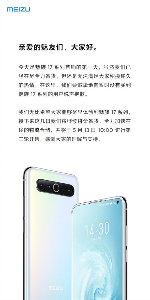 我们无比希望大家能够尽早体验到魅族17系列,接下来这几日我们将继续拼命备货,全力加快在途的物流仓储,并将于5月13日10:00进行第二轮开售,感谢大家的理解与支持。