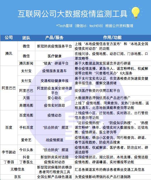 Tech 星球(微信ID:tech618)梳理发现,几乎所有知名互联网公司都上线了与大数据相关的产品和功能,并且差异不大,主要集中在即时通讯、新闻资讯、地图工具类产品团队,功能主要有实时疫情速报、确诊人员活动轨迹可视化、大数据辟谣,在信息流通、辟谣、预警方面发挥了重要作用。