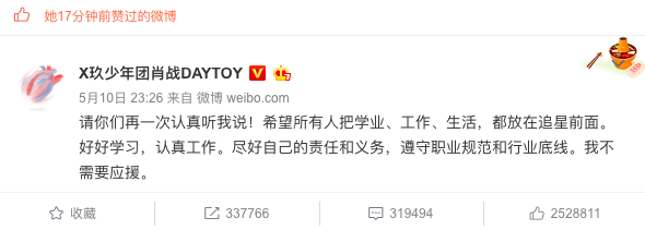 5月10日晚,肖战发文回应网传教师粉丝让班里学生录视频帮他应援一事,“请你们再一次认真听我说!希望所有人把学业、工作、生活,都放在追星前面。好好学习,认真工作。尽好自己的责任和义务,遵守职业规范和行业底线。我不需要应援。
