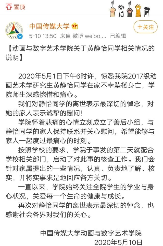坠亡的研究生叫做黄静怡,是中国传媒大学2017级动画艺术学的研究生。