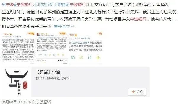 5月6日,宁波银行的一名客户经理难以承受工作压力,于天台跳楼身亡。