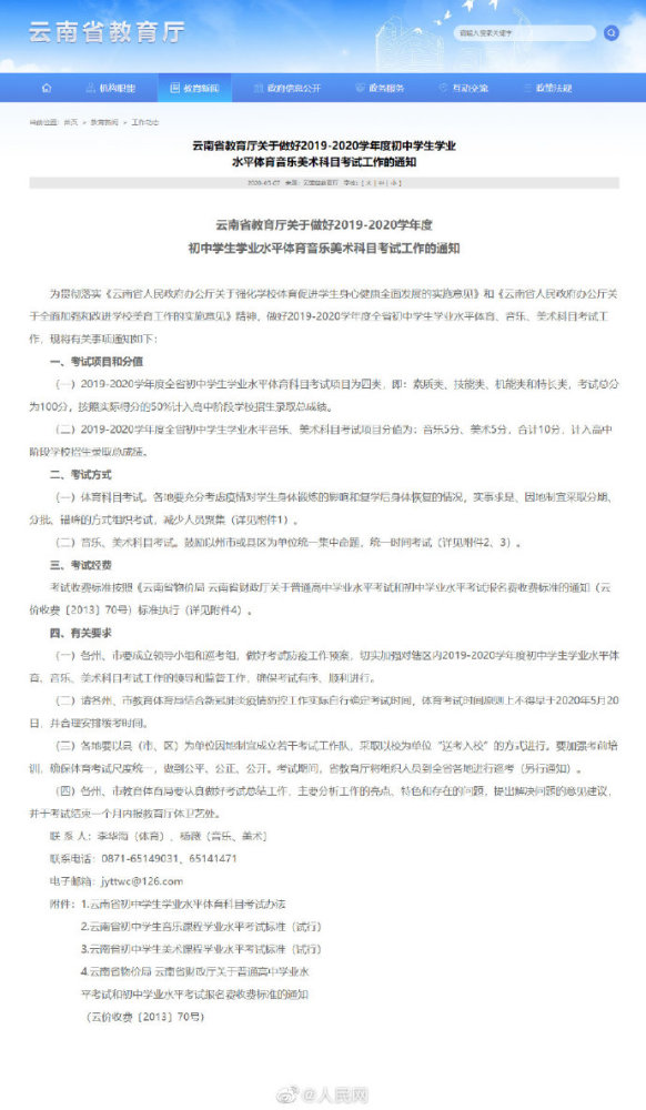 云南体育中考时间日前,云南省教育厅印发通知,明确体育、音乐、美术科目考试项目及分值,5月20日后将分期分批错峰进行考试。据《通知》,体育科目考试总分为100分,项目分为素质类、技能类、机能类和特长类,按照实际得分的50%计入高中阶段学校招生录取总成绩。据了解,这是2019年底云南省中考教育改革体育分值被大幅提高至100分后的首次考试。