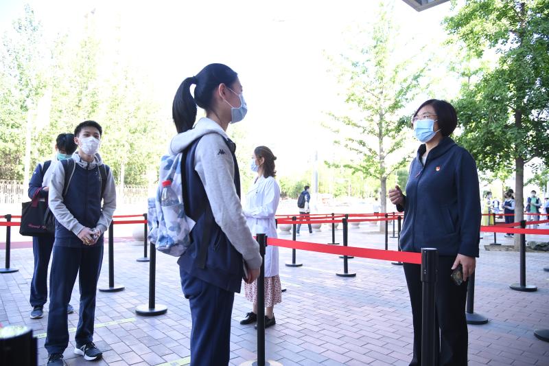 当日,北京市第五中学分校校门监测点,初三年级学生依次通过出示健康码验证、接受体温检测按照指定通道进入校园,开学典礼师生们举行了升国旗仪式并进行了“生命健康”为话题的开学第一课教育。