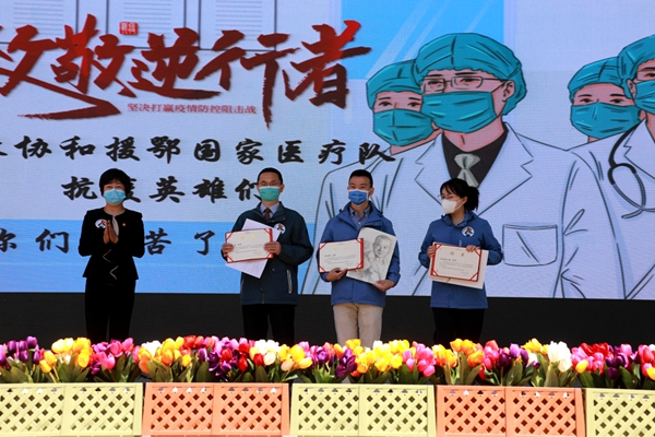 在5月12日国际护士节来临之际,学生代表将同学们创作的美术和书法作品赠送给协和医院援鄂医疗队,以此表达师生们对白衣天使最崇高的敬意。