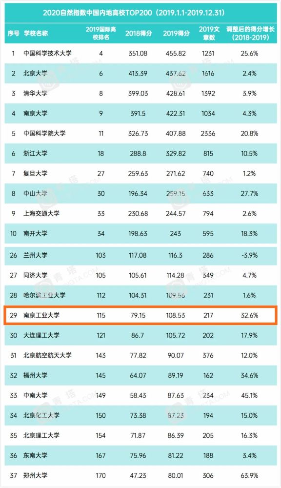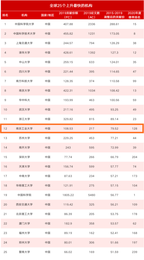 根据2015至2019年调整后的贡献份额的变化情况,在全球25个上升最快的机构榜单中南工大排第12名实力太强了!