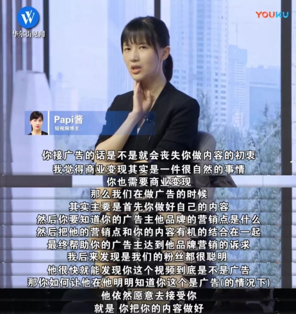 这一点papi在采访的时候也坦诚地说到自己需要商业变现,但是商业变现最重要的前提是内容一定要做好了。
