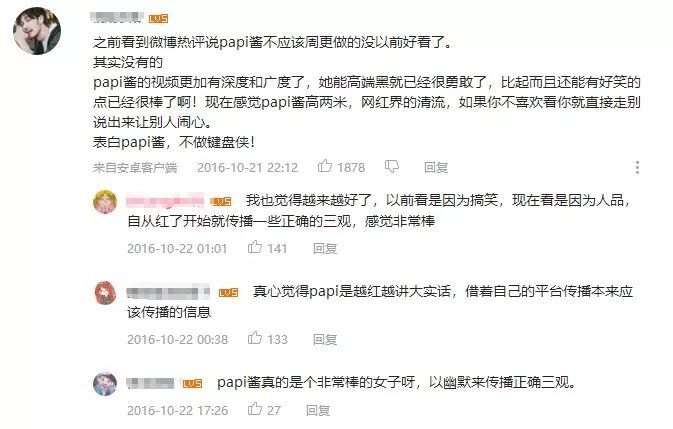 网友们十分支持,可能一开始是被papi酱的幽默吸引,但后来却被她看事情的角度和她自己的生活哲学所折服。