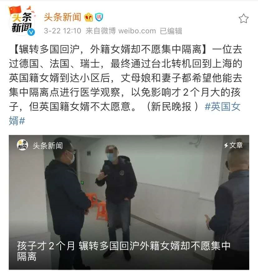 3 月 22 日,一名外籍女婿旅行全球后,要求回家隔离。丈母娘和妻子都希望他能去医院接受观察,但女婿断然反对了。