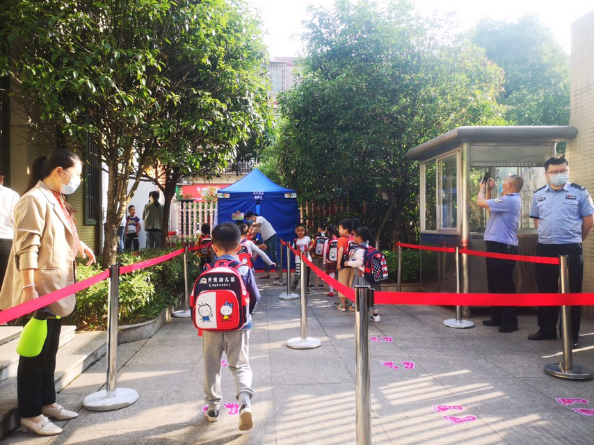5月11日,天心区天悦幼儿园迎来复学第一天,该园实行分批入园方案,当日开学的为大班孩子。幼儿园在校门外通过设置了两条入园通道,家长只能把孩子送到通道入口处,到了这里,按照最新的防疫指南,小朋友可以摘掉口罩轻松入园。在值班老师的引导下,孩子们踩着地面上的小脚印排队前进。依次接受测温、消毒和晨检后,进入到久违的美丽校园。