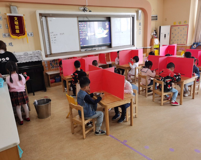 进教室后,小朋友放下书包,就在老师的带领下先排队洗手。随后,没有吃早餐的小朋友来到餐桌前吃饭。小朋友们发现,吃饭与以前不一样了,因为每个桌子上都放置了红色的隔离档板,将一张桌子分隔成四个区域,每个小朋友坐一个区域就餐,互相之间谁也看不到谁。