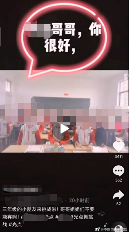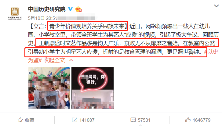 该博主发文称:王朝鼎盛时文艺作品多是钧天广乐,衰败无不从靡靡之音始,在教室内公然引导幼小学生为明星艺人应援,折射的是教育管理的漏洞,更是盛世警钟。