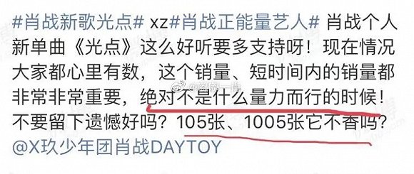 所以当媒体爆出来新歌《光点》的销量受到极端粉丝的控制,出现如:“人手105张不过分吧”“学生党买几十张不过分吧”“我买了115张都不好意思晒”“是任务,必须破亿,没商量”等言论时,过分么?