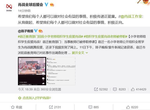 而关于应援视频引发的争议,很快有当地相关部门介入调查。随后公布了结果,据悉,宿迁市沭阳县教育局已对此事作出调查处理,学校对当事老师作出停职停课的处理,教育局对该教师所在学校的校长进行了诫勉谈话,当事老师认识到自己的错误,写了检讨。
