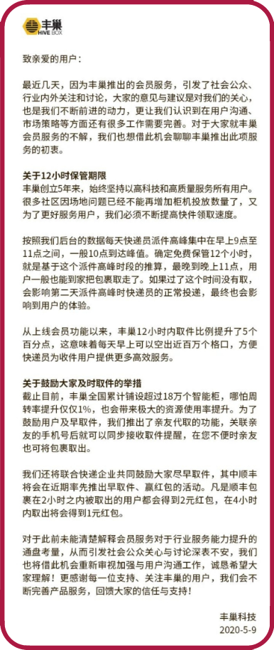 在丰巢最新发布的致用户的公开信中,丰巢对自身to B 的商业逻辑只字不提,反而将自身的商业行为修饰成为收件人提供免费的存储服务。