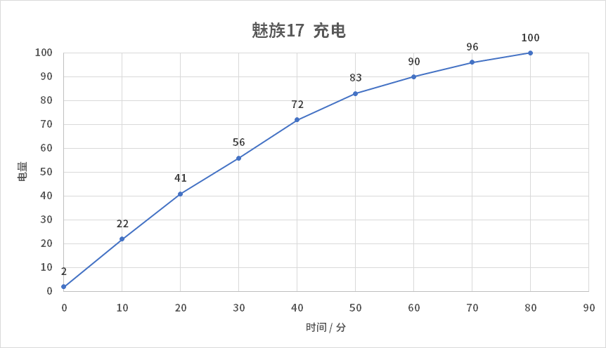 我们测试了一下实际的充电速度,10 分钟可以给魅族17 充入 22% 的电量,30 分钟可以充入 56%,1 小时电量就达到了 90%,最后涓流充电的速度放缓了不少,直到 1 小时 20 分电量才达到 100%。