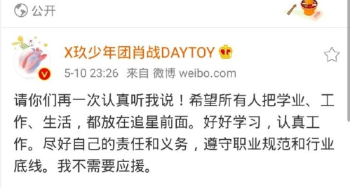 肖战这次并没有选择沉默,而是刚了一回。事发当晚就是5月10号肖战在微博发文回应:“请你们再一次认真听我说!希望所有人把学业、工作、生活,都放在追星前面。好好学习,认真工作。尽好自己的责任和义务,遵守职业规范和行业底线。我不需要应援。”