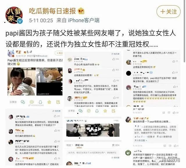 因为papi酱一直被视作“独立女性”的代表,但是却让孩子随父姓,所以有一部分网友群嘲她不注重“冠姓权”。