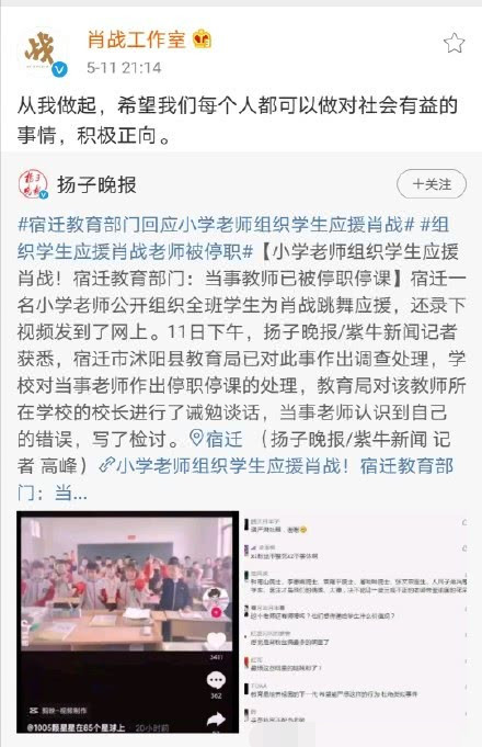 而就在最近,有一个老师为了给偶像肖战应援,要求学生集体拍视频,引发热议。画面中,课堂上几十个孩子做着整齐划一的动作,在这位教师粉丝的引导下,齐声喊着:“肖战哥哥你很好,我们很喜欢,冲啊”。视频的背景音乐是肖战的新歌。经宿迁市教育局核实,宿迁市沭阳县的确有老师带学生给肖战应援。目前,当事老师已停职停课,教育局也对校长进行了诫勉谈话。